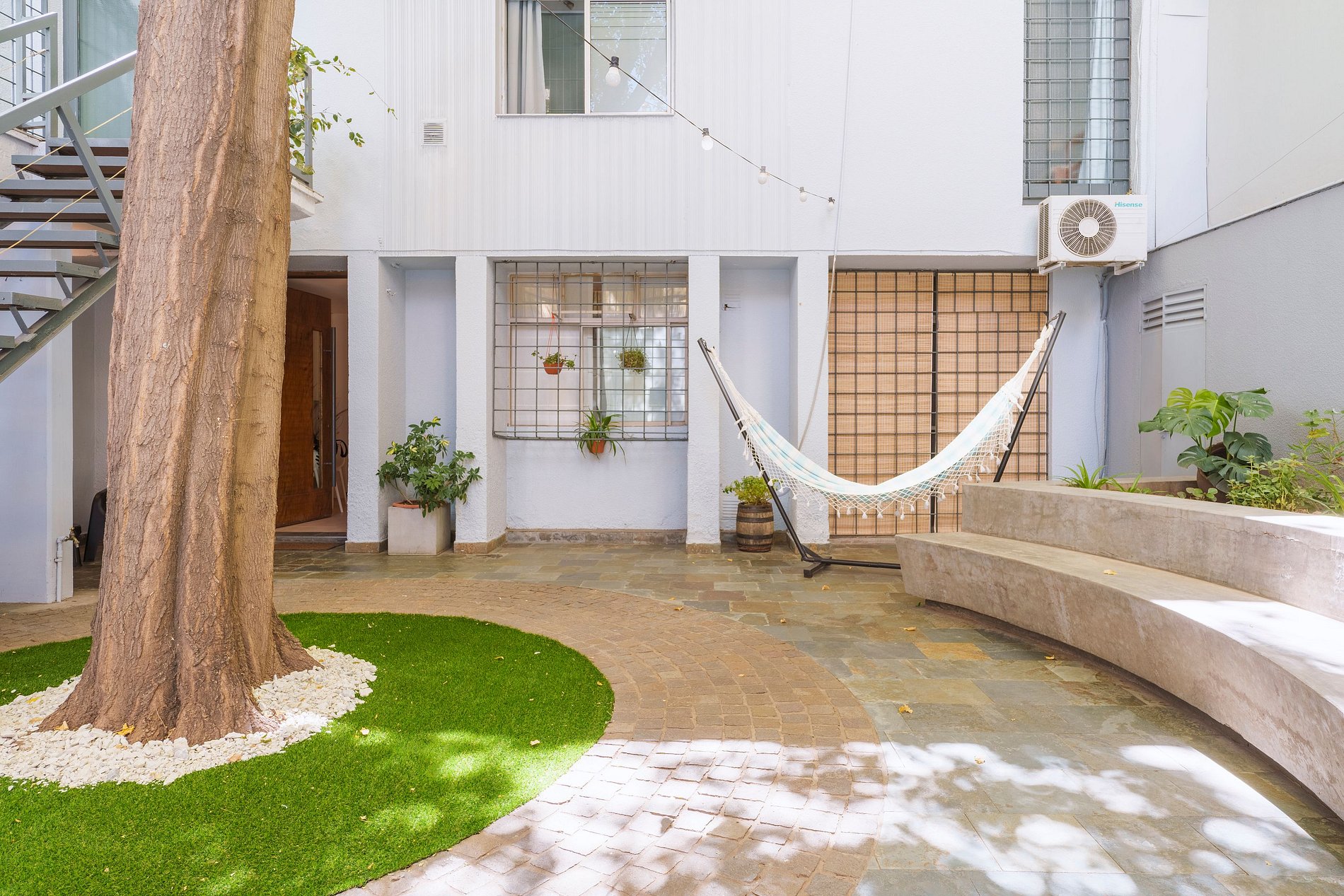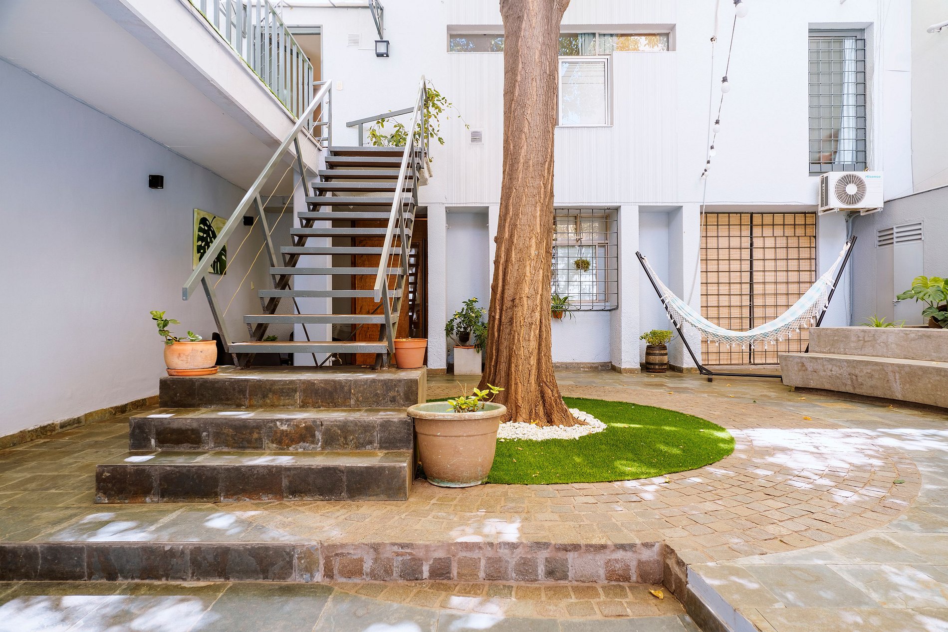 Para disfrutar al aire libre, encontrarás un hermoso patio que cuenta con una hamaca paraguaya y un juego de sillones con mesa, todo rodeado de vegetación y la sombra de un frondoso árbol que abraza el espacio.