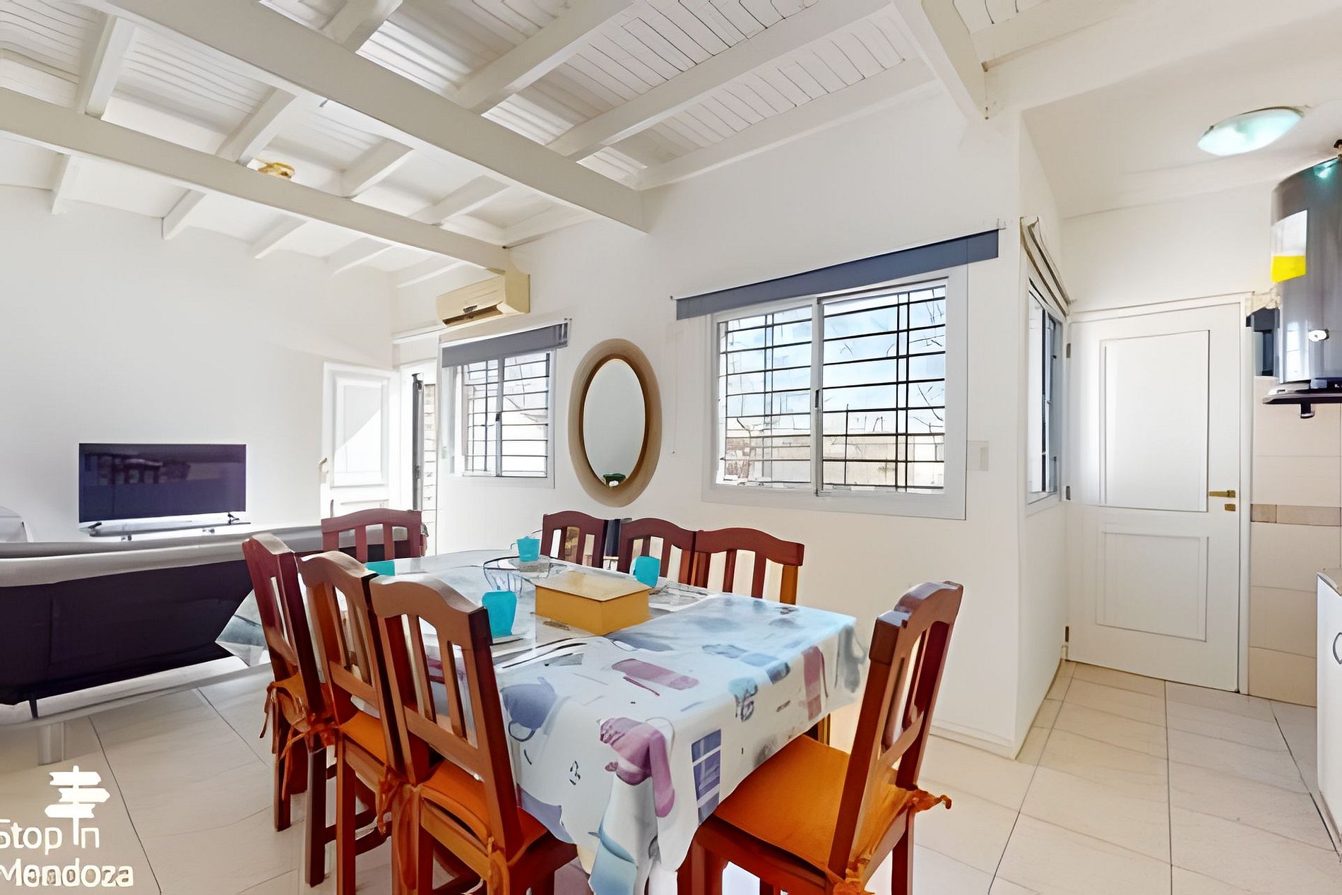 En el estar comedor se encuentra un sofá cama, smat TV de 33", 1 Split frio-calor que se integra con una mesa de madera con 6 sillas y se conecta con la zona de cocina, muy bien equipada para 4 personas con heladera con freezer, horno, microondas, jarra eléctrica, etc
