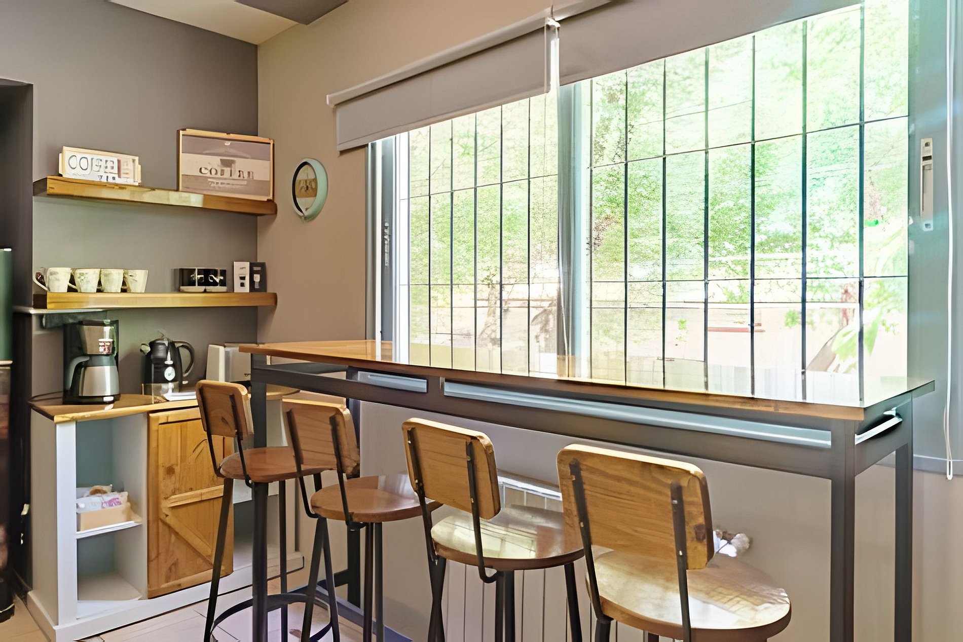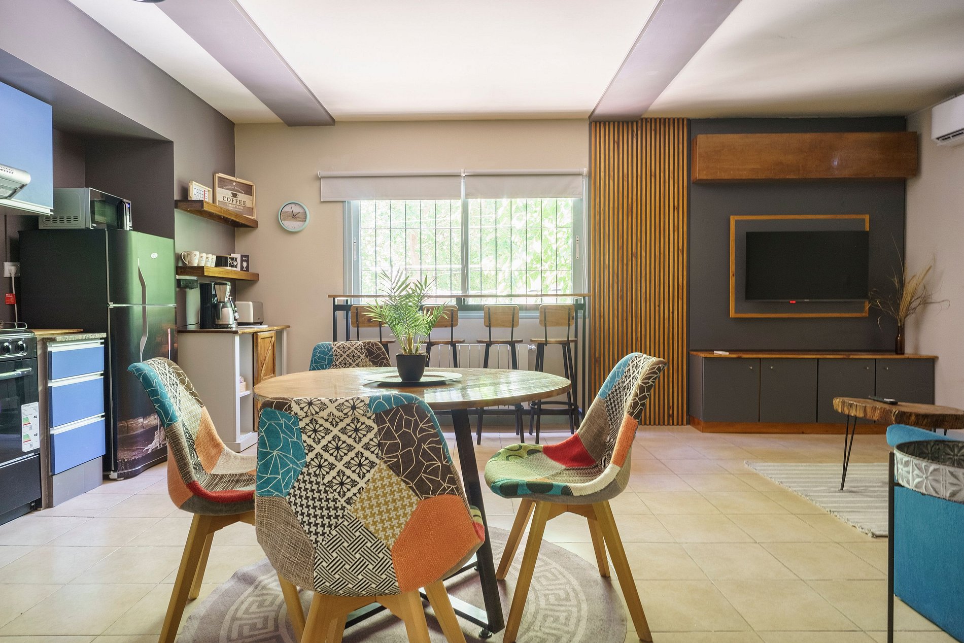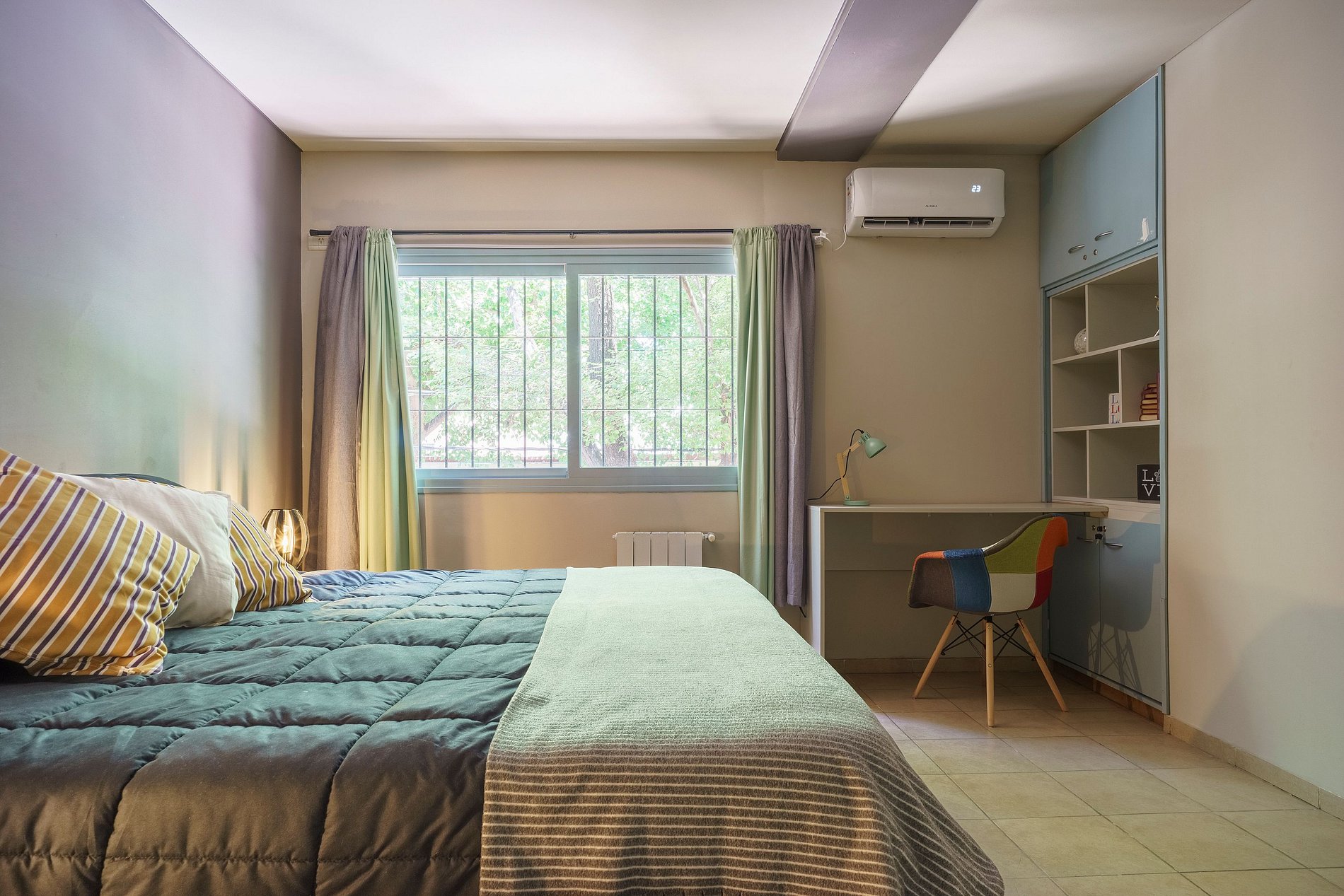 Edificio de solo dos pisos, cuenta con cámaras de seguridad y acceso con cerradura inteligente. El ingreso es por escaleras externas, amplias y bien iluminadas. El departamento se encuentra en el primer piso, es muy luminoso con espacios bien distribuidos, el ingreso de la puerta principal conecta con el living, un sillón de 3 cuerpos, acompañado de dos mesas ratonas, enfrentadas a un smart TV 43", aire acondicionado frío/calor. El comedor está equipado con una mesa y 4 sillas. La cocina cuenta con todos los implementos, para estancias largas , un desayunador muy completo con una barra muy amplia y cómoda con 4 banquetas con vista a los arboles de la calle. Un pequeño pasillo conecta con el dormitorio principal, sumamente amplio y luminoso, cama extra confort King Size con posibilidad por pedido a armarse en dos camas individuales de una plaza cada una, un placar completo de dos puerta; la zona de trabajo con un escritorio funcional, con biblioteca y una cómoda silla. Aire acondicionado frio- calor y cortinas. Finalmente el pasillo que conecta con un baño completo y un pequeño balcón semi serrado, diseñado para aquellos que les gusta disfrutar de esos rincones al aire libre. Internet de alta velocidad! 100 megas Cuenta con cochera techada en las instalaciones para un auto o camioneta.